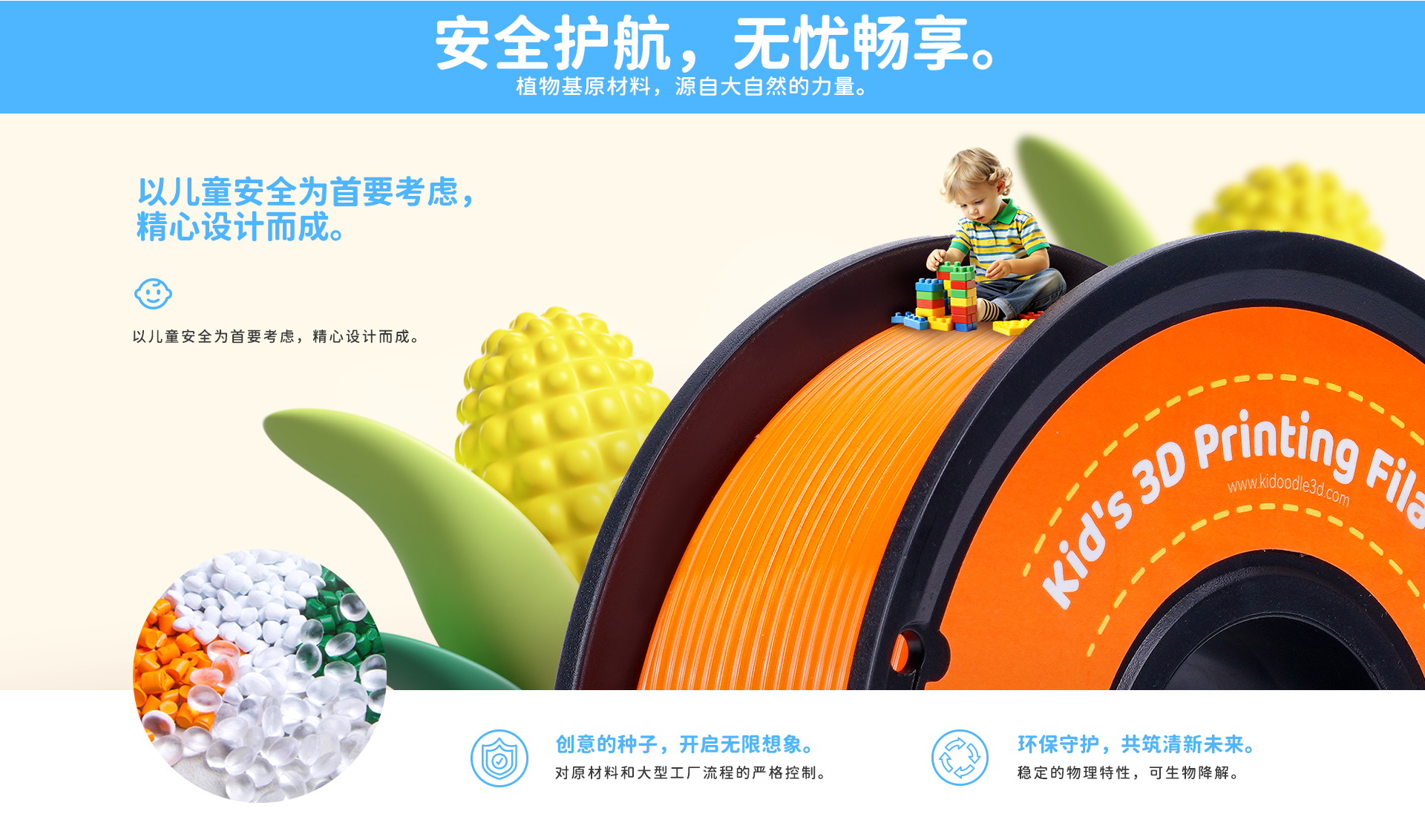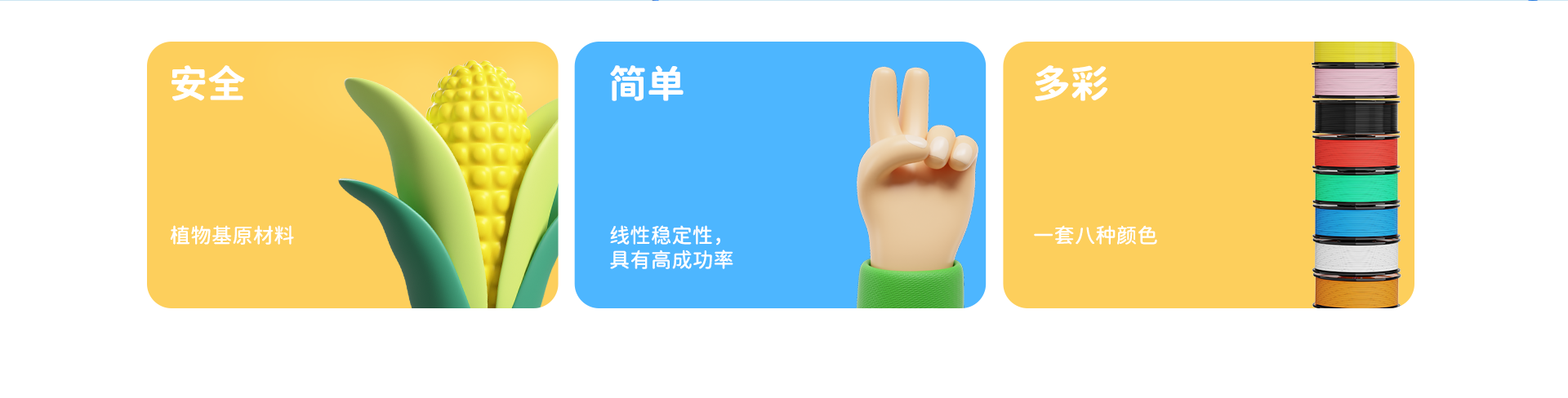 我们的耗材采用植物基材料制成,并经过精心设计,最大程度减少烟雾排放,无毒无害,可安全用于家庭或课堂教学。其低收缩率配方(0.1-0.3%)可确保打印件精准无损,同时我们的环保制造工艺有助于减少对环境的影响。